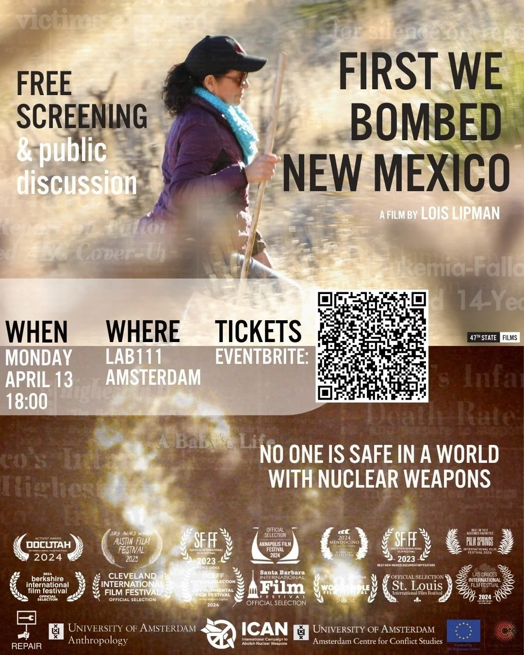 Join the REPAIR project in Amsterdam at the independent cinema Lab111 on 13 April for a free screening of First We Bombed New Mexico. At a moment when a global nuclear arms race is accelerating, treaties have collapsed, and the threat of the use of nuclear weapons feels closer than it has in decades, First We Bombed New Mexico reminds us what is at stake for communities around the world.